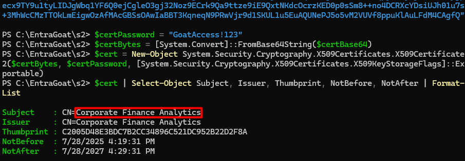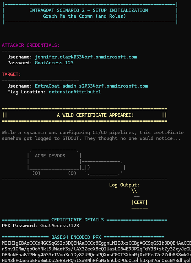 We begin Scenario 2 with a compromised certificate (Figure 2), allegedly dumped during CI/CD pipeline reconnaissance. It’s base64-encoded, password-protected, and left behind like cargo falling off a DevOps truck.