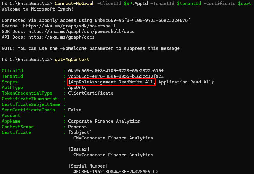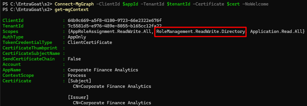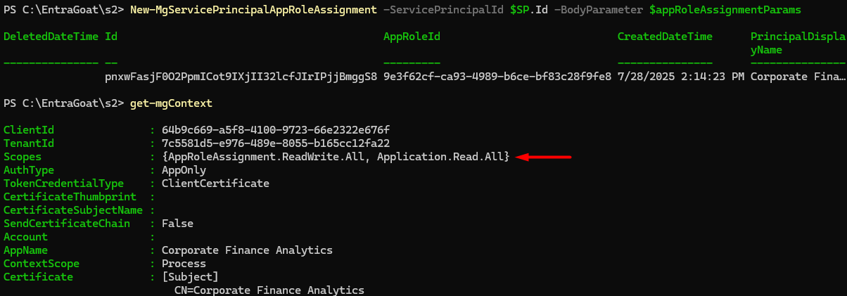 After authenticating as the service principal using the certificate, we check its roles claim in the granted JWT via the Get-MgContext command and discover that it holds AppRoleAssignment.ReadWrite.All (Figure 7).This permission allows the service principal to assign ANY application roles across all service principals—including to itself.