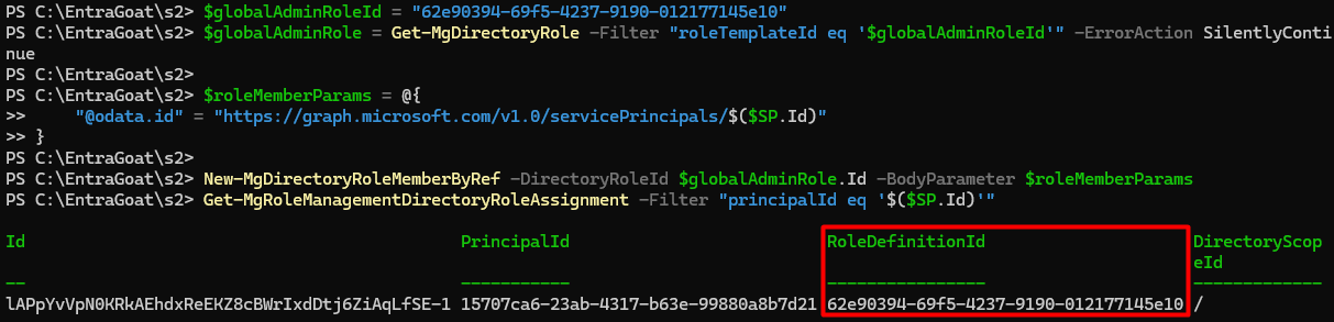 With the RoleManagement.ReadWrite.Directory permission granted, the service principal we have can now modify directory role assignments for any identity in the tenant—including adding itself to the Global Administrator role: