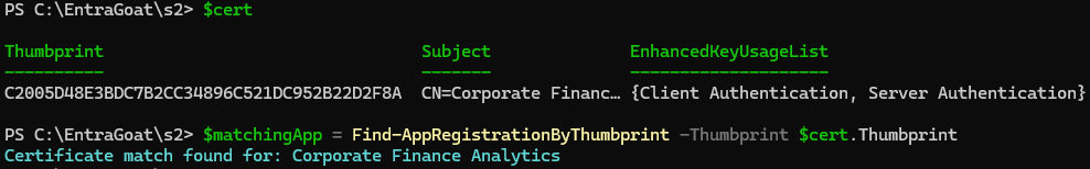 Write-Host "Certificate match found for: $($app.DisplayName)" -ForegroundColor Cyan