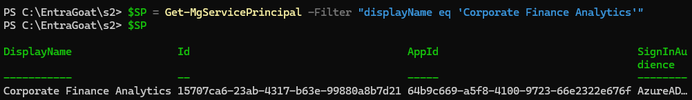 To identify the associated service principal, we authenticate as the low-privileged user using Connect-MgGraproh. Once we extract the AppId behind Corporate Finance Analytics (Figure 5), we are able to authenticate directly as the service principal with the certificate.