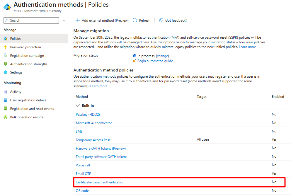 Note: Although CBA is disabled in the tenant (Figure 6), authentication to the service principal using the certificate will still succeed. This is because user-based CBA refers to an interactive, browser-based sign-in experience, while service principals rely on a non-interactive OAuth 2.0 client credentials flow using certificate assertions. Disabling CBA affects only interactive user authentication with certificates and has no impact on programmatic service principal authentication. These are separate authentication paths in the Entra ID platform.