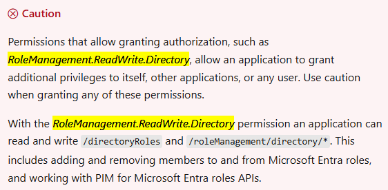 Now that we’ve located the Microsoft Graph service principal and have its assignable OAuth permissions, the next step is choosing which permission to escalate with. The most impactful for our attack purpose is RoleManagement.ReadWrite.Directory, according to a note on the official documentation: