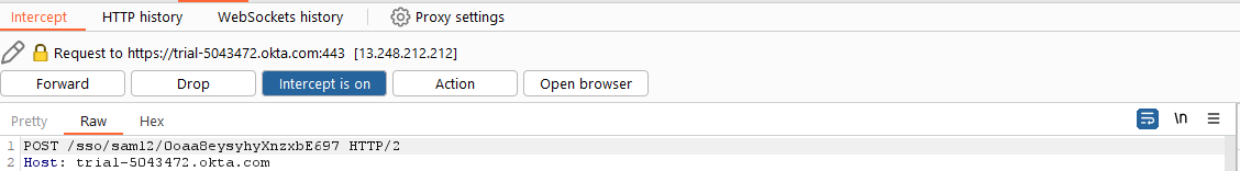 Silver SAML attack using Entra ID as the IdP and Okta as the SP. To launch the attack in an SP-initiated flow, we needed to intercept the SAML request and replace the contents of the SAML response with the forged SAML response that we created (Figure 11). We were able to accomplish these tasks easily by using Burp Suite.