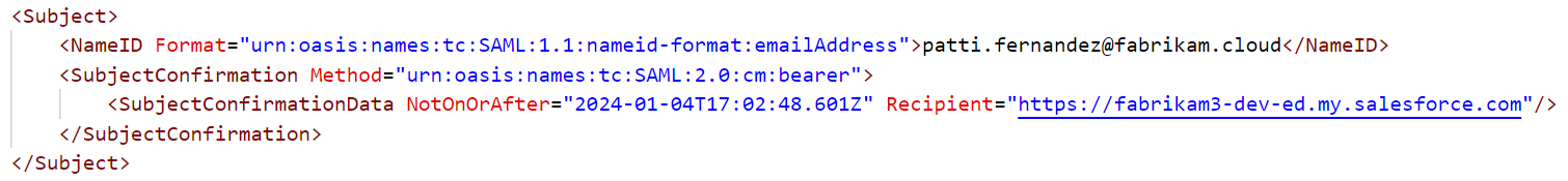 We targeted the user Patti Fernandez, forging a response with her UPN as the subject. The response (Figure 17) was signed using the same SAML signing certificate that was configured for Salesforce in Entra ID.