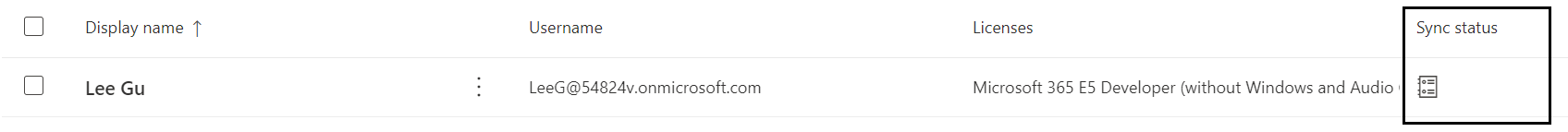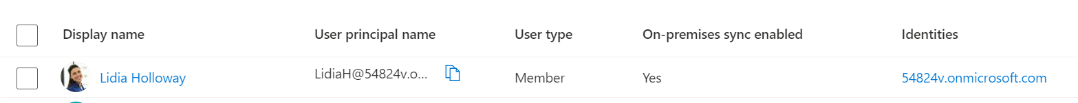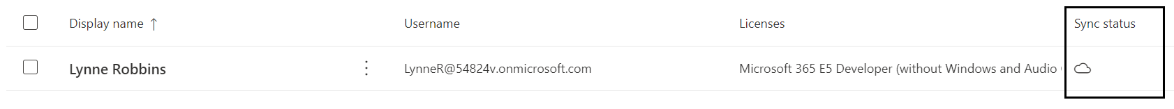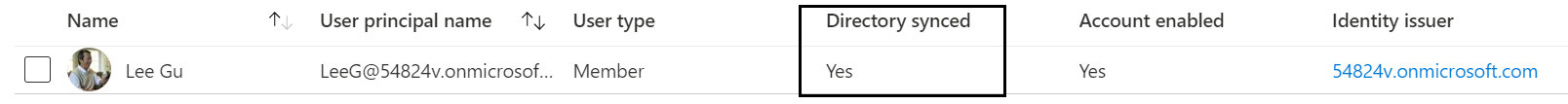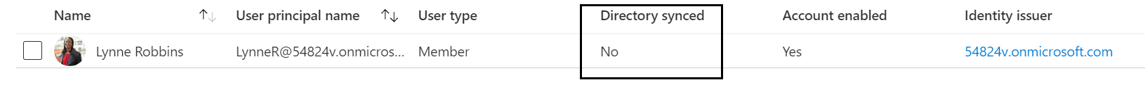 As you can see on the Azure “Users” panel, the user Lee Gu is “Directory synced” while Lynne Robbins is not.