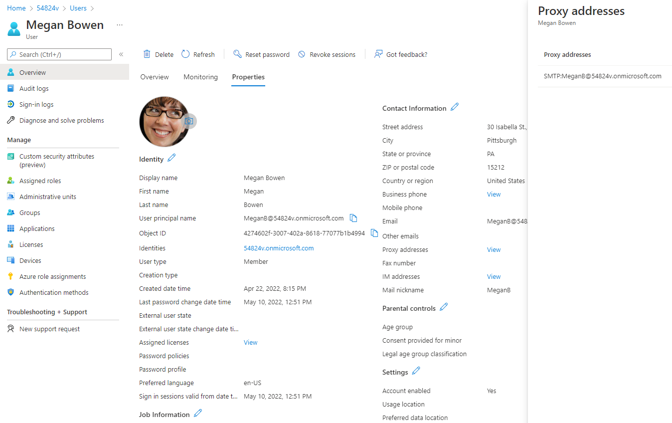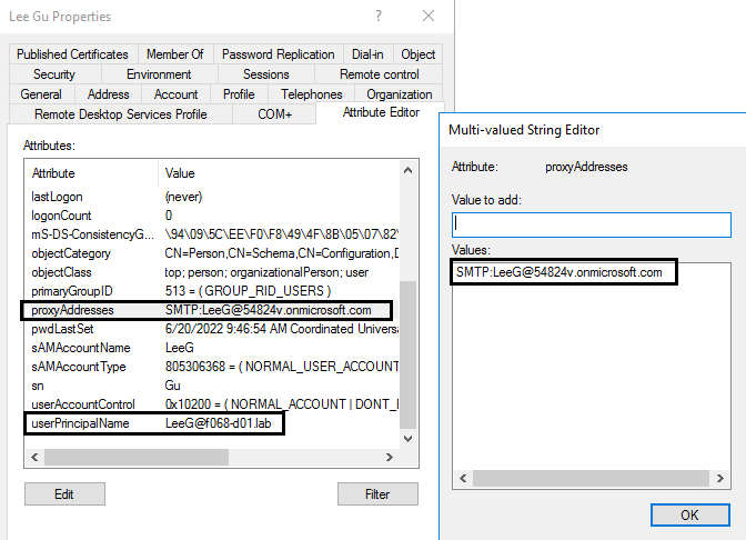 As the steps above describe, we will create a new on-prem user with the same Proxy Address attribute, but we will give it a different UPN: