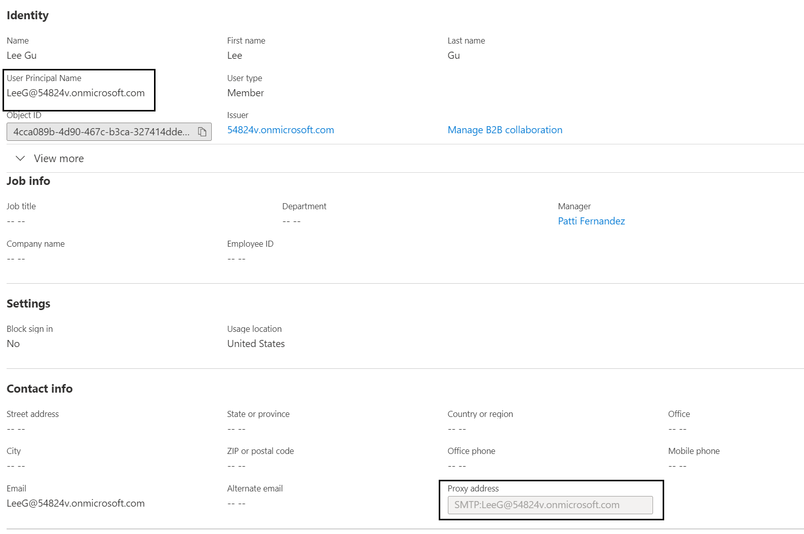 “Lee Gu” user properties on-prem. Here we are creating the user and assigning it the same ProxyAdress and UserPrincipalName as the cloud managed “Lee Gu” user.