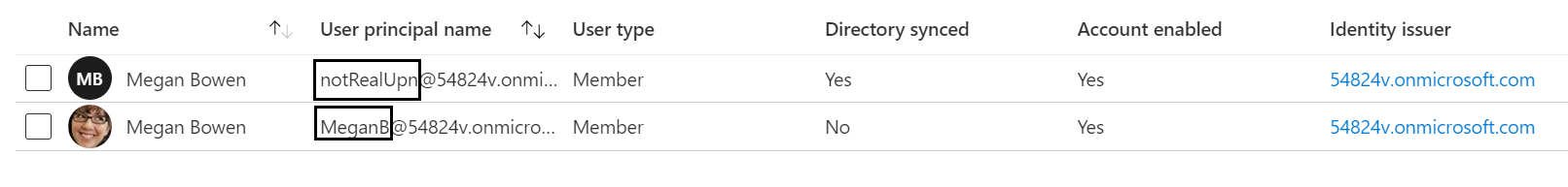 As you can see, now we have 2 users named “Magen Bowen” with different UPN. One of them is synced (the new