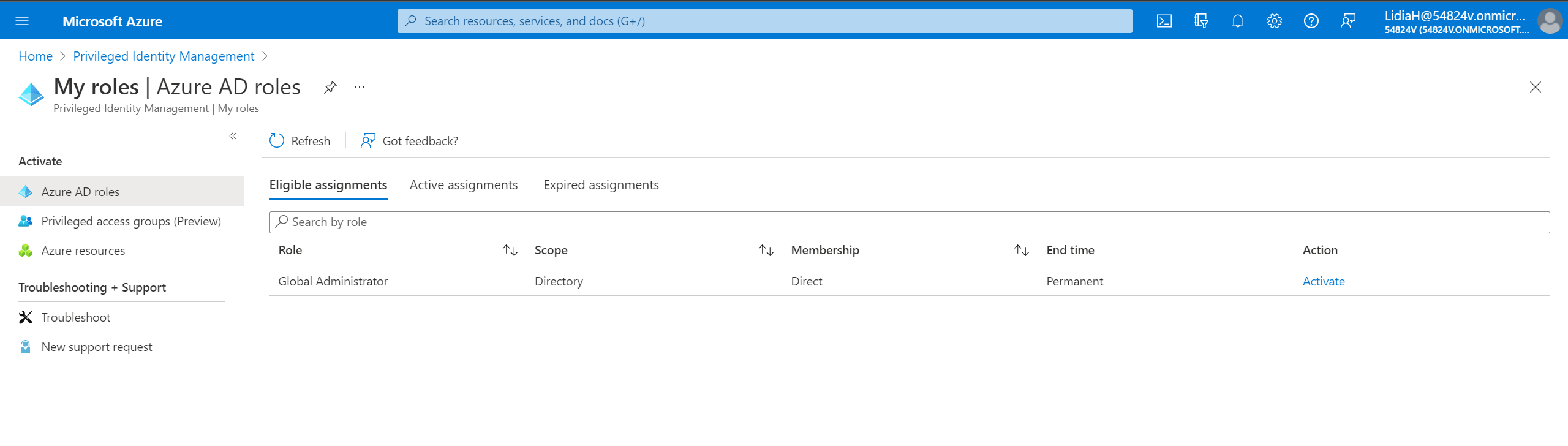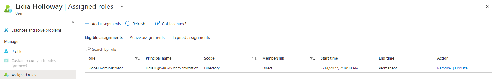 For example, as we saw earlier, the user “Lidia Holloway” is cloud-based user. We can also see that this user is eligible for the “Global Administrator” role.