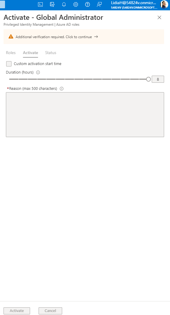 As we can see, to activate global admin role we need to use MFA (“Additional verification required”). If the original cloud user didn’t require MFA, we can just configure it now and activate the role.