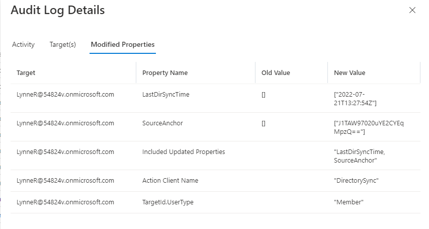 We can see that the Action Client Name is “DirectorySync” and that the old value for Last Dir Sync Time is empty, which means that this is the first time this user is synchronizing with on-prem.