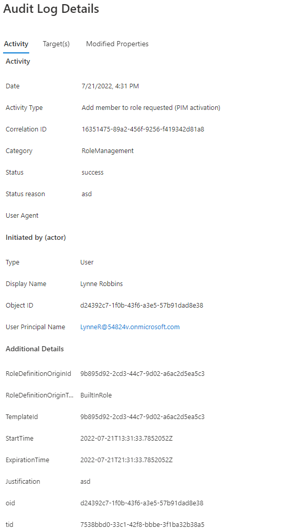 In addition, we can see the role activation in the following log. Using the role definition id attribute, we can search for the role that has been activated.