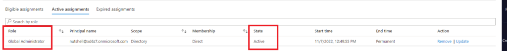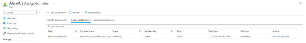 AliceIC is now an Active Global Administrator and acting on behalf of nutshell (Figure 8). As mentioned earlier, you will find no trace of these changes in on-prem logs and only minimal trace in Entra ID logs.