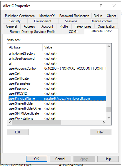 First, the attacker copies the nutshell Entra ID UPN to the AliceIC on-prem AD userPrincipalName attribute (Figure 4).