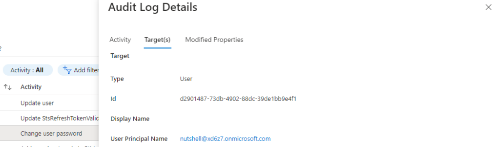 You can reasonably (although not definitively) assume that this attack has occurred if two log events occur one after another in Entra ID: “Change user password” followed by “Update User” with a changed DisplayName and a target that uses the same UPN (Figure 9, Figure 10).